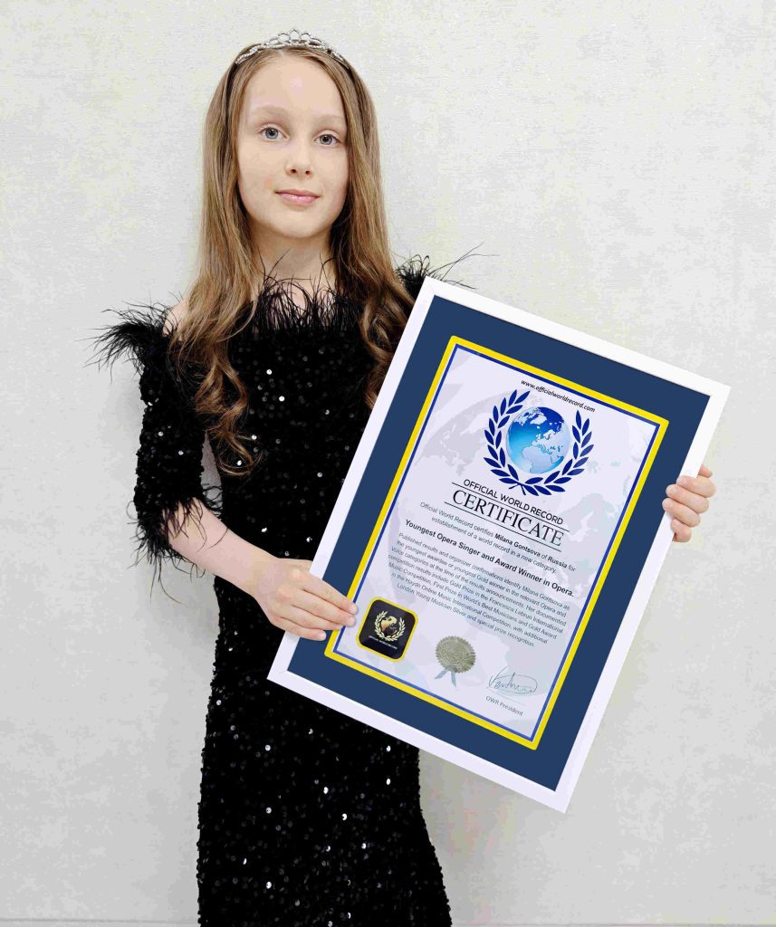 Milana Gontsova of Russia has officially established a world record under the title Youngest Opera Singer and Award Winner in Opera. Recognized for her exceptional achievements at an extraordinarily young age, Milana has gained international attention in the field of classical vocal performance. Her record reflects documented competition victories, confirmed results from international organizers and consistent excellence across multiple prestigious platforms. Opera is widely regarded as one of the most demanding forms of musical expression. It requires advanced vocal control, emotional depth, breath support, projection, language precision and stage discipline. For most performers, serious operatic training develops over many years, often beginning in late childhood or adolescence. Milana Gontsova’s accomplishments stand out because she achieved international recognition in opera competitions before reaching the age when most children formally begin structured music education.